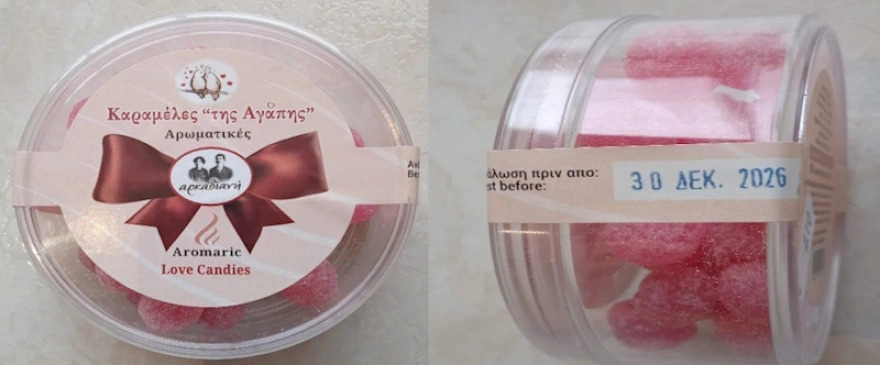 Καραμέλες «της Αγάπης – Αρωματικές», με ημερομηνία ανάλωσης πριν από τις 30 Δεκεμβρίου 2026, συσκευασίας καθαρού βάρους περίπου 110 γραμμαρίων, της εταιρείας με διακριτικό τίτλο «Αρκαδιανή», που εδρεύει στο Ψάρι Αρκαδίας.