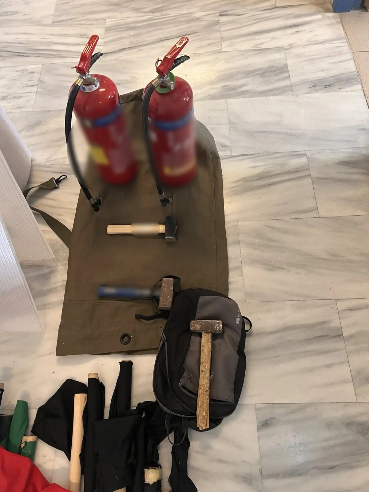 Κατά την έρευνα που έγινε στον χώρο βρέθηκαν σφυριά, καδρόνια, μάσκες, πλακάτ, αντιασφυξιογόνες μάσκες και κράνη.