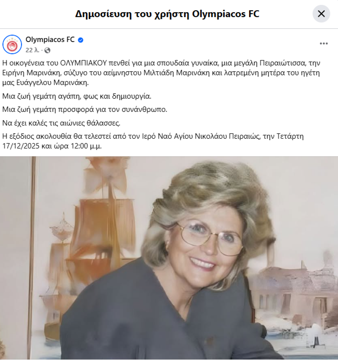 Η εξόδιος ακολουθία θα τελεστεί από τον Ιερό Ναό Αγίου Νικολάου Πειραιώς, την Τετάρτη 17/12/2025 και ώρα 12:00 μ.μ.»