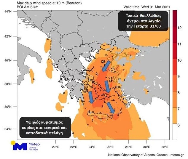 Όσον αφορά στους ενισχυμένους ανέμους κατά τη διάρκεια της Τετάρτης 31/03, στον προγνωστικό χάρτη που ακολουθεί, παρουσιάζονται με βέλη οι επικρατούσες διευθύνσεις των ανέμων, ενώ οι κόκκινες αποχρώσεις και οι αναγραφόμενες τιμές αποτυπώνουν τις εκτιμώμενες μέγιστες εντάσεις τους.
