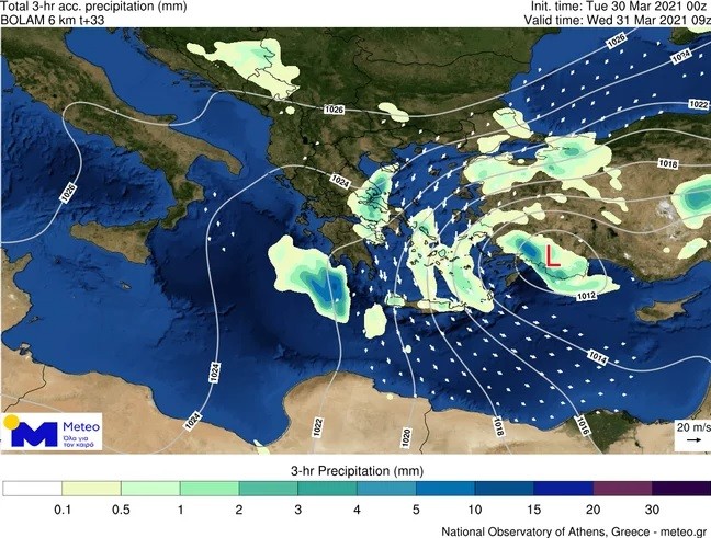Ένα βαρομετρικό χαμηλό στο Νοτιοανατολικό Αιγαίο αναμένεται να επηρεάσει τον καιρό της χώρας το διήμερο της Τετάρτης 31/3 και Πέμπτης 1/4, σύμφωνα με το Meteo. του Εθνικού Αστεροσκοπείου Αθηνών.