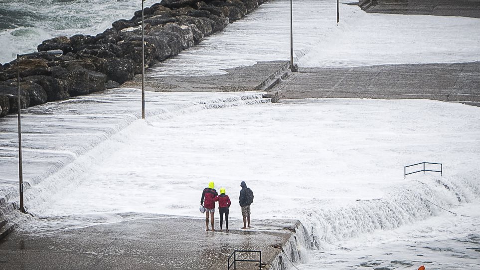 Στη Σκόπελο τεράστια κύματα «πλημμύρισαν» το λιμάνι, με κάποιους τολμηρούς πάντως να κατεβαίνουν για βόλτα σε αυτό.
