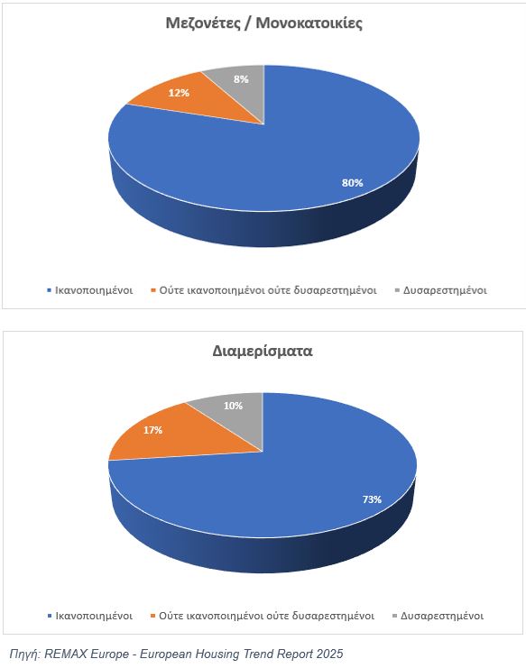 Όσον αφορά τα επίπεδα ικανοποίησης, αυτά εμφανίζονται υψηλότερα σε όσους κατοικούν σε μεζονέτες και μονοκατοικίες (80%), σε σύγκριση με εκείνους που ζουν σε διαμερίσματα (73%). Ιδιαίτερα στους ιδιοκτήτες μονοκατοικιών, το ποσοστό ικανοποίησης φτάνει το 82%, στοιχείο που υποδηλώνει ότι όσο μεγαλύτερο και πιο ευρύχωρο είναι ένα σπίτι, τόσο αυξάνεται η αίσθηση ικανοποίησης των κατοίκων του.