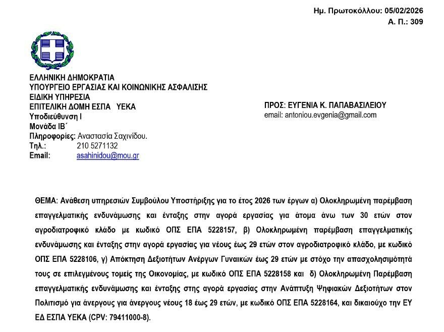 Έξι χρόνια μετά, το 2026, το ίδιο όνομα επανέρχεται. Νέες συμβάσεις, νέοι ρόλοι, νέες απευθείας αναθέσεις για υποστήριξη και παρακολούθηση προγραμμάτων, πάλι στον χώρο της κατάρτισης, πάλι σε διαδρομές που συνδέονται με ΕΣΠΑ και δημόσια κονδύλια.