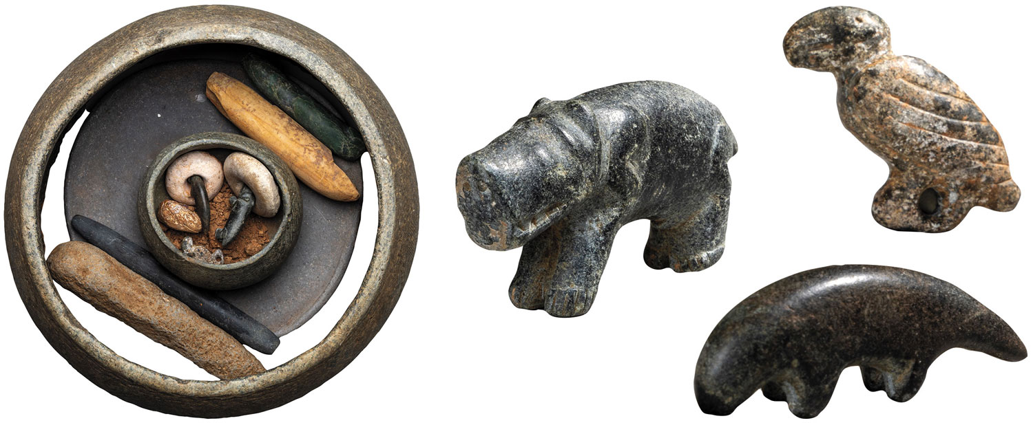 6. Πέτρινο μπολ με ειδώλια ζώων (αριστερά) και τα πέτρινα ειδώλια ζώων (δεξιά) από το Καραχάντεπε της Τουρκίας
