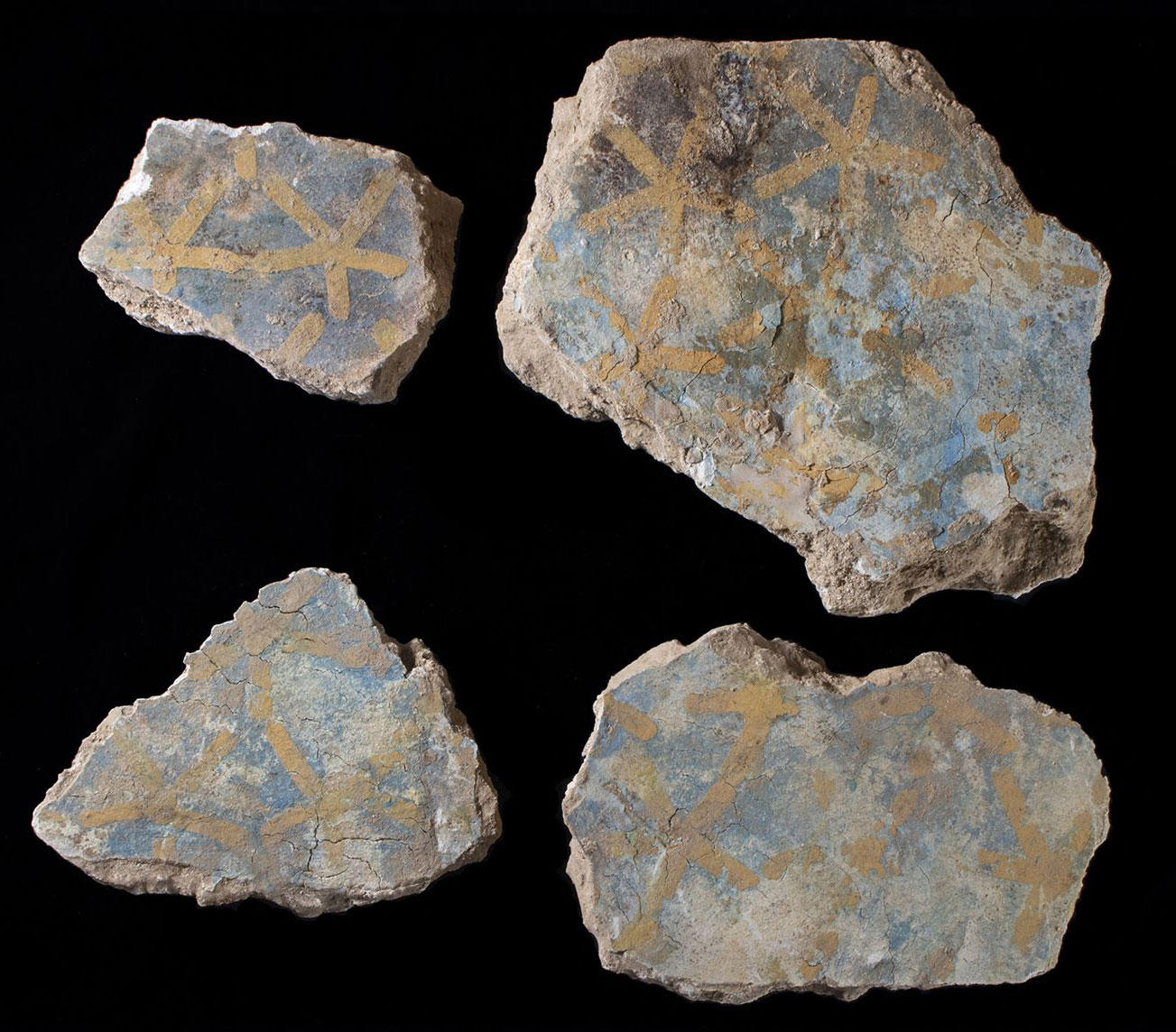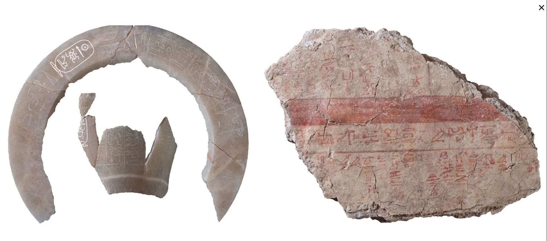 9. Χείλος αλαβάστρινου αγγείου με το όνομα του Τουθμώση Β’ και θραύσματα αλαβάστρινου βάζου με τα ονόματα του Τουθμώση Β’ και της Χατσεπσούτ (αριστερά). Θραύσμα του Αμντουάτ από τον Τάφο του Τουθμώση Β’ (δεξιά)