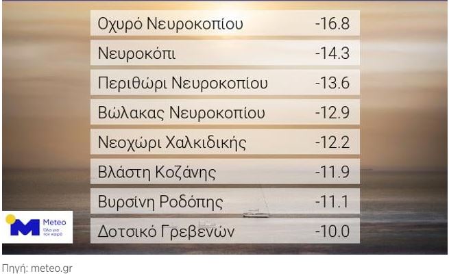 Σύμφωνα με το δίκτυο αυτόματων μετεωρολογικών σταθμών του Εθνικού Αστεροσκοπείου Αθηνών / meteo.gr, η χαμηλότερη ελάχιστη θερμοκρασία καταγράφηκε στο Οχυρό Νευροκοπίου, όπου ο υδράργυρος υποχώρησε στους -16.8 °C. Οι οκτώ χαμηλότερες ελάχιστες θερμοκρασίες που καταγράφηκαν σήμερα τις πρωινές ώρες παρουσιάζονται στον παρακάτω πίνακα: