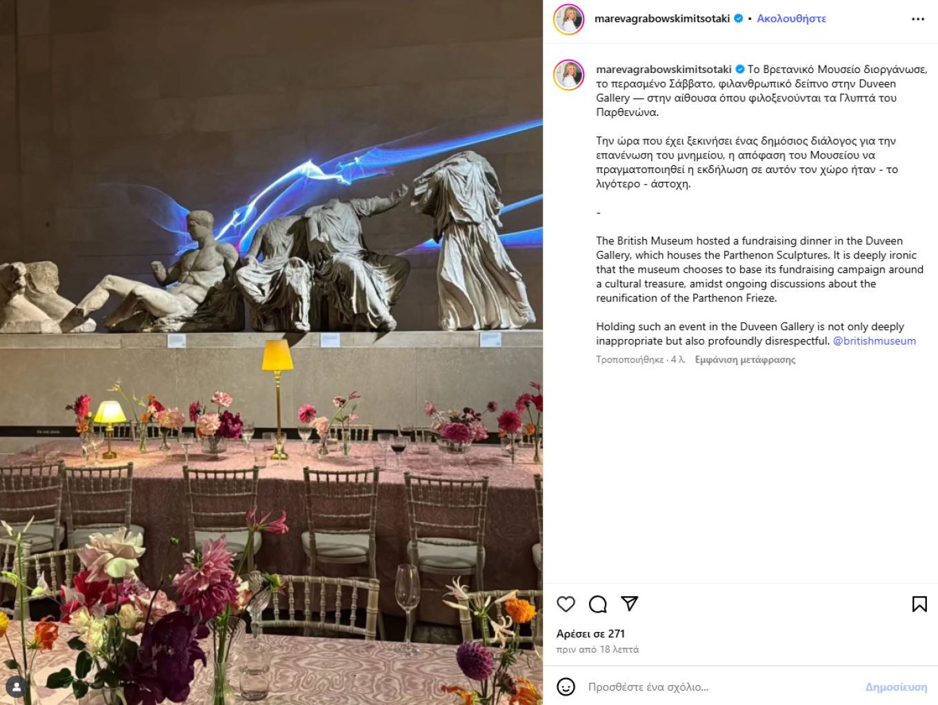 Με ανάρτησή της στα κοινωνικά δίκτυα, η Μαρέβα Γκραμπόφσκι-Μητσοτάκη εξέφρασε την έντονη δυσαρέσκειά της για την πρωτοβουλία του Βρετανικού Μουσείου να διοργανώσει φιλανθρωπικό δείπνο στην Duveen Gallery, τον χώρο όπου φυλάσσονται τα Γλυπτά του Παρθενώνα.