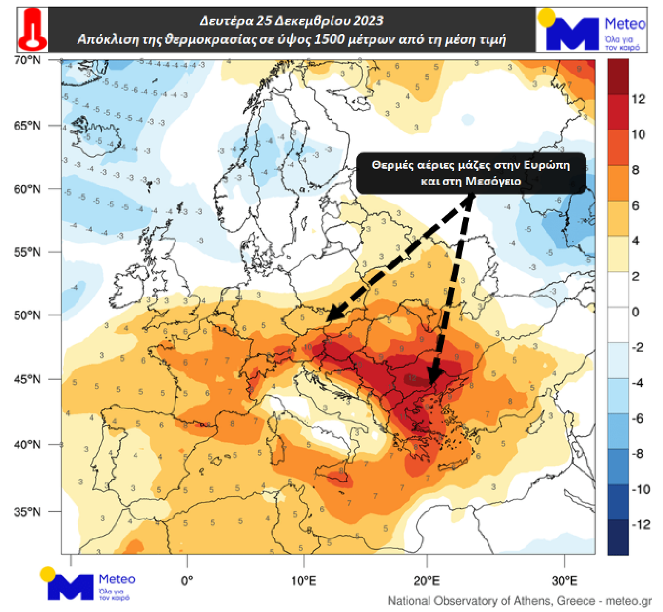Στον σχετικό χάρτη του meteo.gr / Εθνικού Αστεροσκοπείου Αθηνών παρουσιάζεται η απόκλιση της θερμοκρασίας από την μέση τιμή της περιόδου 1979-2010 σε ύψος περίπου 1500 μέτρων το μεσημέρι των Χριστουγέννων, (Δεύτερα 25/12).