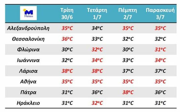 Όπως φαίνεται και στον πίνακα που ακολουθεί και παρουσιάζει το meteo.gr οι υψηλές θερμοκρασίες θα διατηρηθούν έως την Παρασκευή. Σήμερα στο κέντρο της Αθήνας η θερμοκρασία θα φτάσει τους 35 βαθμούς.