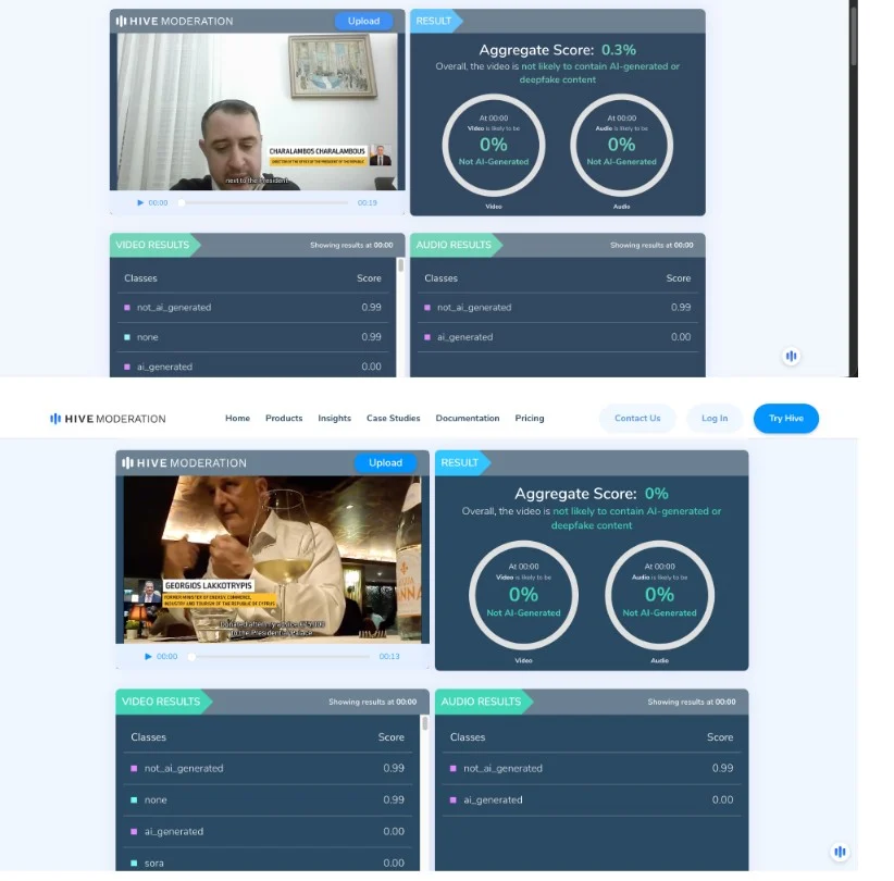 Στο πλαίσιο του fact-checking, όπως αναφέρει το Sigmalive, πραγματοποιήθηκε τεχνική ανάλυση με εργαλεία ανίχνευσης ΑΙ και deepfake, συγκεκριμένα μέσω των πλατφορμών Hive Moderation και InVID-WeVerify. Οι έλεγχοι δεν ανέδειξαν σαφείς ή αξιόπιστες ενδείξεις ότι το υλικό έχει παραχθεί ή αλλοιωθεί με τεχνητή νοημοσύνη, ειδικά στα σημεία όπου εμφανίζονται πρόσωπα και ομιλία.