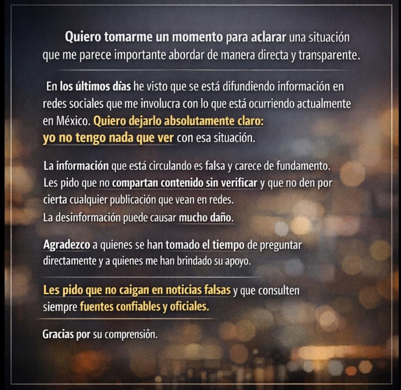 «Διαδίδεται μια πληροφορία ότι υποτίθεται ότι έχω δημοσιεύσει ιστορίες για το τι συνέβη στο Μεξικό. Θέλω να διευκρινίσω ότι όλα αυτά είναι ΕΝΤΕΛΩΣ ΨΕΥΔΗ! Είμαι άτομο που δεν του αρέσουν τα προβλήματα, δεν μου αρέσει να μπλέκω με κανέναν και θέλω να απολαμβάνω το πάρτι με ηρεμία. Σας παρακαλώ, αν δείτε δημοσιεύσεις όπως τις παρακάτω, να τις αναφέρετε!» έγραψε η Χουλίσα στο Instagram.