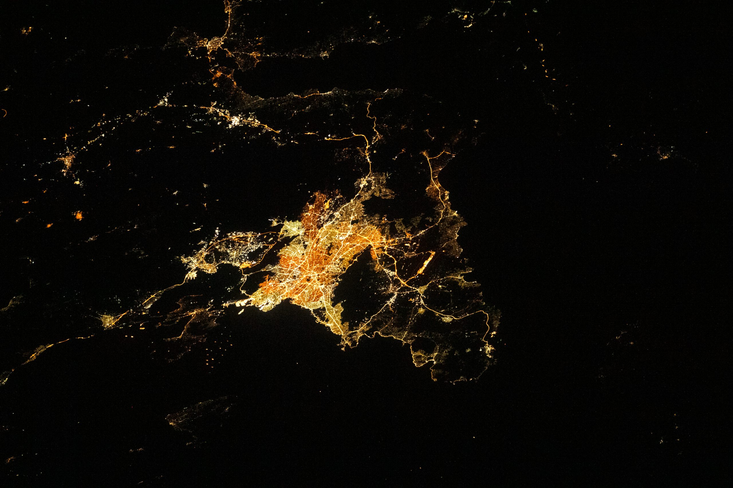 Ένας αστροναύτης στον Διεθνή Διαστημικό Σταθμό τράβηξε αυτή τη νυχτερινή φωτογραφία της Αθήνας, της πρωτεύουσας της Ελλάδας. Η πόλη βρίσκεται στη σύνθετη ακτογραμμή της Αττικής Χερσονήσου στη Νότια Ελλάδα. Οι δρόμοι ελίσσονται στην πόλη σαν φωτισμένα ποτάμια και η αστική εξάπλωση εκτείνεται μέχρι την ακτή.