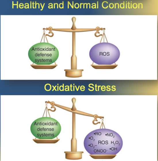 Το οξειδωτικό στρες είναι μια ανισορροπία μεταξύ των ελευθέρων ριζών και των αντιοξειδωτικών στο σώμα. Οι ελεύθερες ρίζες (ROS), είναι ασταθή μόρια με ένα ή περισσότερα ασύζευκτα ηλεκτρόνια.