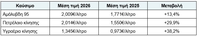 Σημειώνεται ότι οι υπολογισμοί έχουν γίνει με μέσους δείκτες αγοράς για τον μήνα Απρίλιο 2026 από το Παρατηρητήριο Τιμών Υγρών Καυσίμων