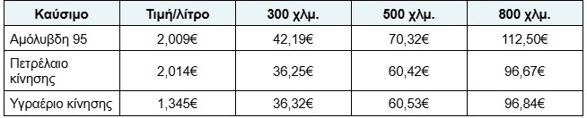 Ο υπολογισμός έγινε με βάση τις τρέχουσες μέσες τιμές ανά λίτρο για αμόλυβδη 95, πετρέλαιο κίνησης και υγραέριο.