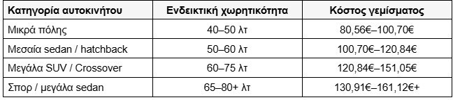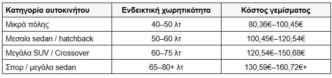 Με μέση τιμή 2,014€/λίτρο, το κόστος γεμίσματος διαμορφώνεται περίπου ως εξής: