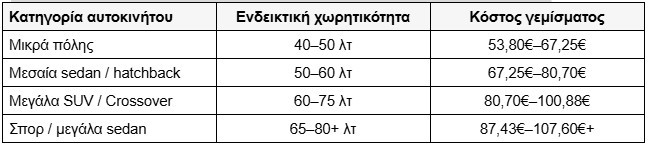 Με μέση τιμή 1,345€/λίτρο, το κόστος γεμίσματος διαμορφώνεται περίπου ως εξής: