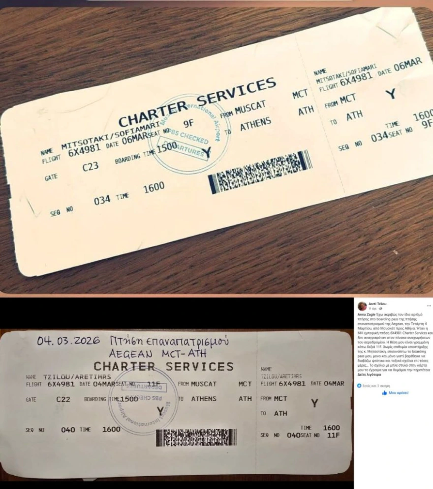Η Σοφία Μητσοτάκη απάντησε στους ισχυρισμούς αναρτώντας ένα στόρυ στον λογαριασμό της στο Instagram. Συγκεκριμένα, ανάρτησε την κάρτα επιβίβασής της, αναφέροντας ότι ταξίδεψε στις 6 Μαρτίου 2026, με “προγραμματισμένη πτήση charter” της Aegean από το Ομάν, και όχι από το Ντουμπάι, ενώ προχώρησε και σε εξώδικο εναντίον του φερόμενου ως αρχισυντάκτη του “Καρδίτσα στα Άκρα”.