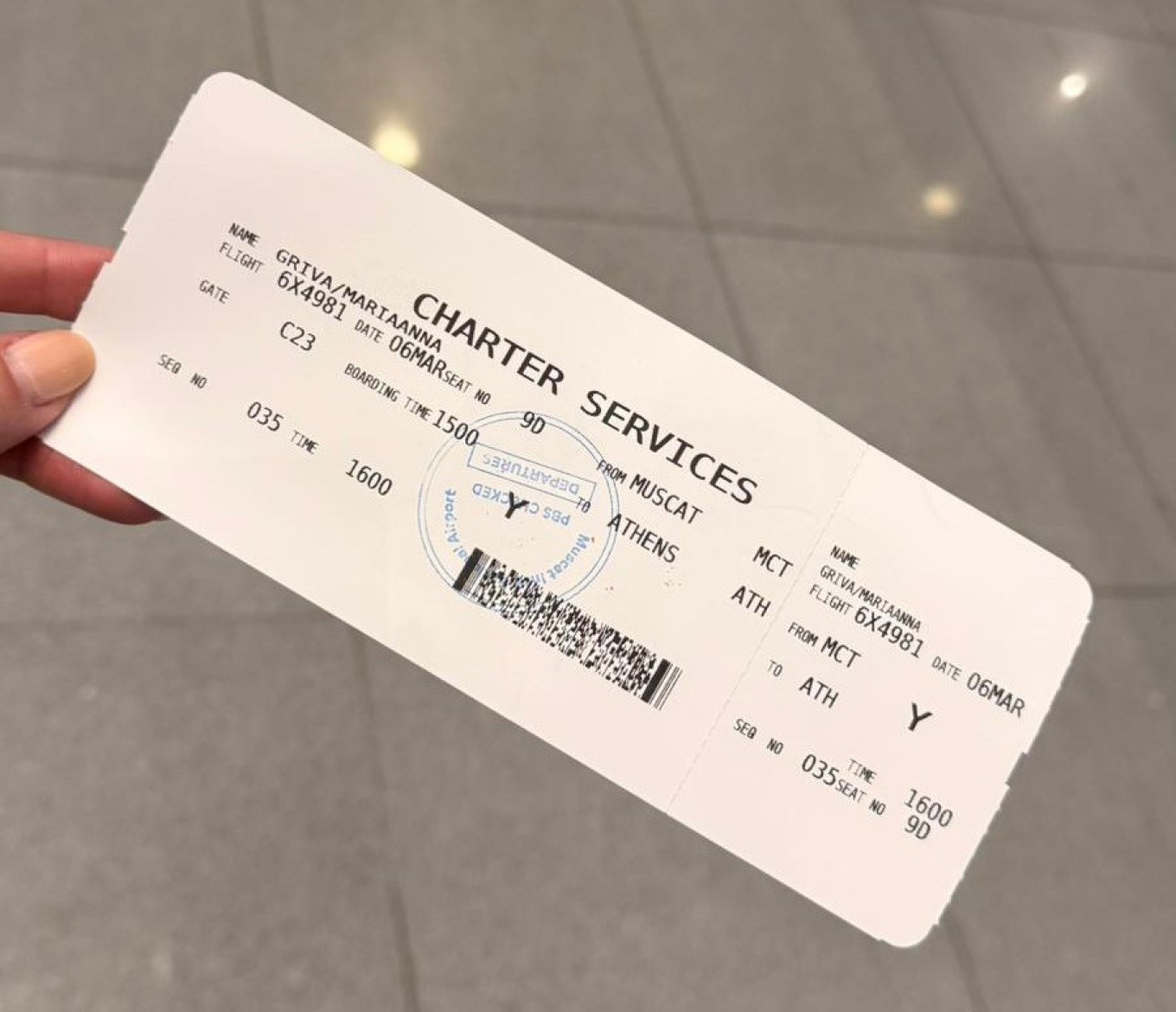 Με βάση την κάρτα επιβίβασης της Σοφίας Μητσοτάκη, η πτήση της Aegean είχε κωδικό 6X4981 και αναχωρούσε στις 16:00 (τοπική ώρα), με προορισμό την Αθήνα. Ανατρέχοντας στο ιστορικό των αναχωρήσεων του Διεθνούς Αερολιμένου του Μουσκάτ, στο Flightradar24, εντοπίσαμε μία και μοναδική πτήση της Aegean στις 6 Μαρτίου 2026 με κωδικό AEE4981 (ίδιος καταληκτικός αριθμός με αυτόν της κάρτας επιβίβασης), που αναχωρούσε στις 16:00 με προορισμό την Αθήνα.