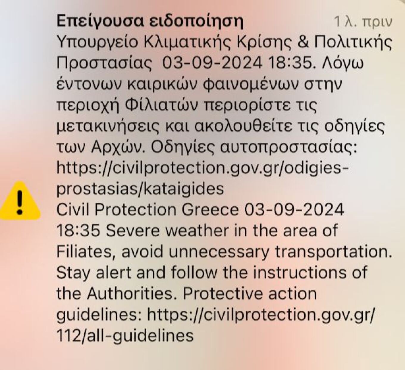 Μήνυμα από το 112 εστάλη σε όσους βρίσκονται στη Θεσπρωτία και συγκεκριμένα, στους Φιλιάτες, λόγω των δυσμενών καιρικών συνθηκών.
