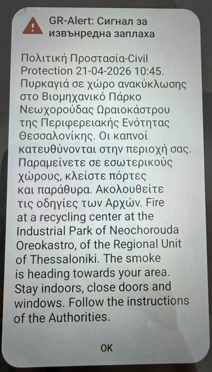 Λίγο μετά την έναρξη της πυρκαγιάς ενεργοποιήθηκε το σύστημα έκτακτης ειδοποίησης, με το 112 Ελλάδα να αποστέλλει προειδοποιητικό μήνυμα στους πολίτες, καλώντας τους να παραμείνουν σε εσωτερικούς χώρους, με κλειστά παράθυρα και πόρτες λόγω της κατεύθυνσης των καπνών.