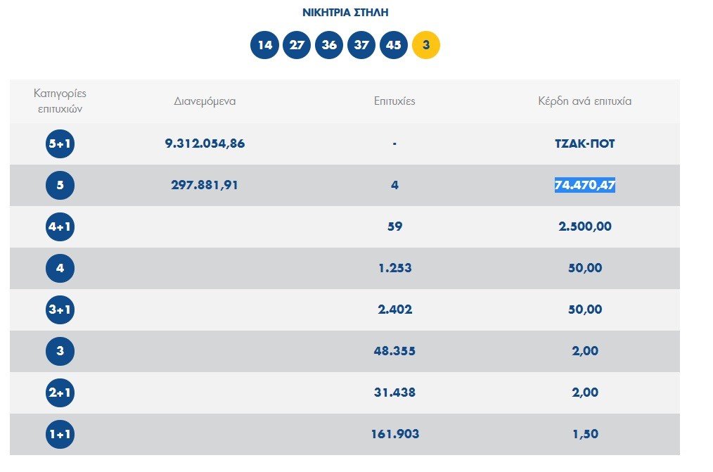 Οι τυχεροί αριθμοί που ανέδειξε η κληρωτίδα ήταν οι 14, 27, 36, 37, 45 και τζόκερ το 3.