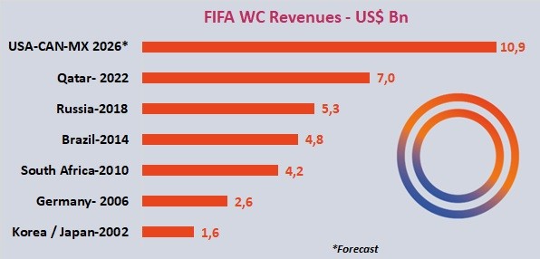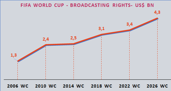 -Τα τηλεοπτικά δικαιώματα πιθανότατα θα φτάσουν στα 4,3 δισ. δολάρια, ενώ οι χορηγίες θα ξεπεράσουν τα 2,8 δισ. δολάρια — και τα δύο νέα ρεκόρ για τη FIFA.