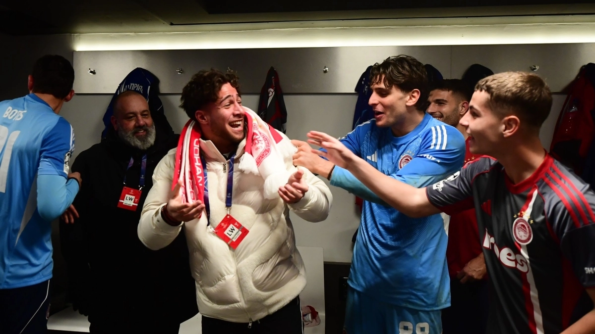 Με τη λήξη της αναμέτρησης στη «Γιόχαν Κρόιφ Αρένα», οι παίκτες των «ερυθρόλευκων» πανηγύρισαν έντονα τη μεγάλη επιτυχία μαζί με τους φίλους της ομάδας που βρέθηκαν στο γήπεδο, με το κλίμα ενθουσιασμού να μεταφέρεται και στα αποδυτήρια.