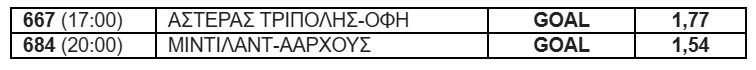 Ο ΟΦΗ έχει 2 νίκες και 5 ήττες και δίνει σήμερα το πρώτο του ματς με τον Χρήστο Κόντη στον πάγκο του. Θα προσπαθήσει να πάρει βαθμό ή βαθμούς. Αποφεύγω το σημείο σε αυτό το ματς και ποντάρω στο Goal. Και οι 2 ομάδες πετυχαίνουν αλλά και δέχονται γκολ στα περισσότερα παιχνίδια τους. Στις 6 τελευταίες αγωνιστικές ο Αστέρας μετράει 5 Goal και ο ΟΦΗ 4.