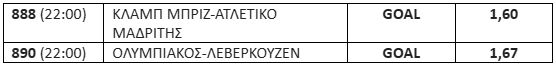 Η Κλαμπ Μπριζ είναι δυνατή στην έδρα της συνήθως βρίσκει δίχτυα. Θέλει τη νίκη για να ελπίζει να πάρει την πρόκριση αφού θα έχει δύσκολο έργο στη ρεβάνς στη Μαδρίτη. Λογικά θα σκοράρει και η Ατλέτικο. Αποφεύγω το ποντάρισμα σε σημείο και πάω κι εδώ με το Goal.