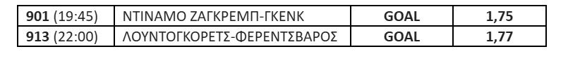 Αφήνω όμως τα παιχνίδια των ελληνικών ομάδων και επιλέγω 2 Goal από το Europa League. Δύσκολο στην πρόβλεψη σημείου είναι το ματς της Ντιναμό Ζάγκρεμπ με την Γκενκ. Μικρό προβάδισμα λόγω έδρας έχει η Ντιναμό, αλλά η Γκενκ είναι επικίνδυνη και μπορεί να σκοράρει. Το Goal είναι πιθανό. Δεν νομίζω ότι θα μείνει «άσφαιρη» στην έδρα της η Ντιναμό, αλλά δύσκολα θα κρατήσει και το μηδέν στην άμυνα κόντρα σε μία ομάδα που βρίσκει δίχτυα στα περισσότερα παιχνίδια της.