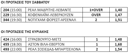 Δύο τριάδες ξεχώρισα για το Σαββατοκύριακο με φαβορί και Over. Στην Ισπανία η Ρεάλ Μαδρίτης, μετά το … κάζο στο Κύπελλο (αποκλείστηκε με 3-2 από την Αλμπαθέτε), δεν θέλει να κάνει γκέλα και στο πρωτάθλημα. Βρίσκεται 4 πόντους πίσω από την Μπαρτσελόνα και δεν έχει περιθώρια για απώλειες. Πιστεύω ότι θα κερδίσει τη Λεβάντε, ίσως και με μεγάλο σκορ. Συνδυάζω τον «άσο» της με το Over.