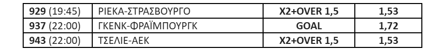 Από το Europa League ξεχώρισα 1 Goal, στον αγώνα της Γκενκ με την Φράιμπουργκ. Η επιλογή σημείου είναι παρακινδυνευμένη, αφού πρόκειται για αμφίρροπο ματς, ανοιχτό σε κάθε αποτέλεσμα. Η Γκενκ ποντάρει στην έδρα της για να κερδίσει και να ελπίζει σε πρόκριση εν όψει της δύσκολης ρεβάνς στη Γερμανία. Η Φράιμπουργκ θα ψάξει το γκολ στο Βέλγιο και μπορεί να το πετύχει. Το Goal είναι πιθανό.