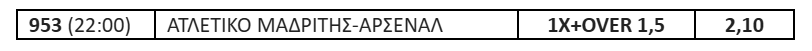 Το τελευταίο δίμηνο η Άρσεναλ δεν είναι στα καλύτερά της, ενώ η Ατλέτικο έχει ρίξει όλο το βάρος της στο Champions League. Πιστεύω ότι δύσκολα η ομάδα του Ντιέγκο Σιμεόνε θα χάσει στο Metropolitano. Ποντάρω στη διπλή ευκαιρία 1Χ και τη συνδυάζω με το Over 1,5 για να ανέβει η απόδοση.