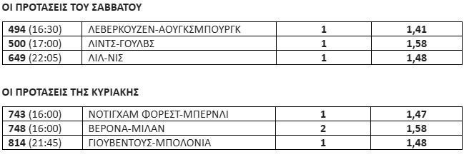Ξεχώρισα 6 δυνατά φαβορί για το Σαββατοκύριακο. Το πρώτο είναι από την Bundesliga, η Λεβερκούζεν στο ματς με την Άουγκσμπουργκ. Προέρχεται από τη μεγάλη εκτός έδρας νίκη με 0-1 στο ντέρμπι με την Ντόρτμουντ και δίνει μάχη για να πάρει το εισιτήριο για το Champions League. Η Άουγκσμπουργκ έφερε ισοπαλία 2-2 με την Χοφενχάιμ, συμπλήρωσε 5 παιχνίδια χωρίς νίκη (0-2-3) και βρίσκεται σε απόσταση ασφαλείας από τις επικίνδυνες θέσεις. Ο «άσος» είναι πιθανός.