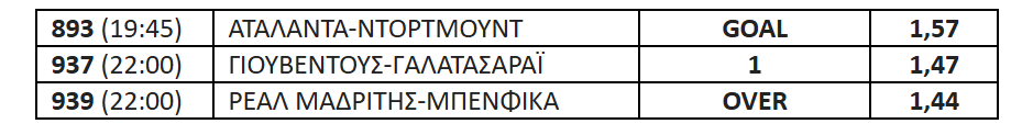 Τα παιχνίδια του Champions League ξεχωρίζουν και στο σημερινό κουπόνι του στοιχήματος. Αμφίρροπο είναι το πρώτο χρονικά ματς ανάμεσα στην Αταλάντα και την Ντόρτμουντ.