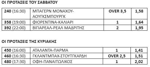 Την πιο μεγάλη απόδοση από τις σημερινές προτάσεις έχει το «διπλό» της Ρεάλ Μαδρίτης στο ματς με τη Βιγιαρεάλ. Μετά την ήττα της Μπαρτσελόνα από τη Ρεάλ Σοσιεδάδ την πλησίασε στον 1 βαθμό και μπήκε γερά στη μάχη για τον τίτλο. Στο Champions League συνέτριψε με 6-1 τη Μονακό. Μπορεί να πάρει τη νίκη σε ένα δύσκολο πάντως παιχνίδι.