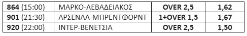 Αρκετά παιχνίδια περιλαμβάνει το σημερινό κουπόνι του στοιχήματος. Οι επιλογές που έκανα είναι από την Premier League και τα Κύπελλα Ελλάδας και Ιταλίας.