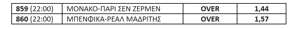 Το πιθανότερο είναι να έχει πάνω από 2 γκολ και η σημερινή αναμέτρησή τους. Η Μπενφίκα ξέρει ότι για να ελπίζει σε πρόκριση πρέπει να πάρει τη νίκη, αφού η ρεβάνς στο Μπερναμπέου θα είναι πολύ δύσκολη. Η Ρεάλ θα είναι πολύ προσεχτική για να μην πάθει και πάλι ζημιά σε αυτό το γήπεδο. Θα παίξει κι αυτή για τη νίκη. Το Over έχει τύχη και σε αυτό το ματς.