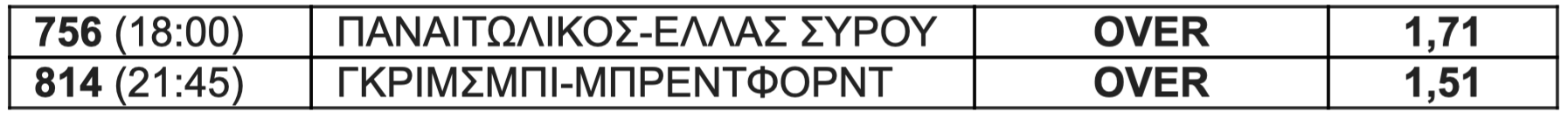 Δύο Over από το Κύπελλο Ελλάδας και το League Cup Αγγλίας ξεχώρισα από το σημερινό κουπόνι. Ο Παναιτωλικός έχει 2 ήττες στη League Phase του Κυπέλλου Ελλάδας και χρειάζεται τη νίκη στο θεωρητικά εύκολο ματς με την Ελλάς Σύρου.