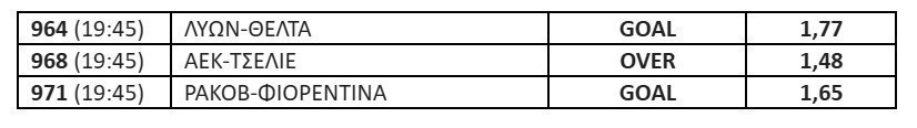 Από τα άλλα 2 Κύπελλα Ευρώπης είναι οι σημερινές προτάσεις μας. Στο Europa League έληξε ισόπαλη με 1-1 η πρώτη αναμέτρηση της Λυών με τη Θέλτα στο Βίγκο. Βλέπω να γίνεται ανοιχτό ματς και στη ρεβάνς με τις 2 ομάδες να σκοράρουν. Ποντάρω στο Goal.