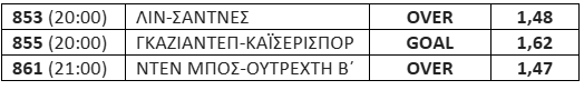 Στην τριάδα συμπεριέλαβα και 1 Goal από το τουρκικό πρωτάθλημα, στον αγώνα της Γκαζιάντεπ με την Καϊσέρισπορ. Αδιάφορη βαθμολογικά είναι η γηπεδούχος, ηττήθηκε με 2-1 στο τελευταίο ματς από τη Ρίζεσπορ και συμπλήρωσε 5 σερί Goal. Κινδυνεύει με υποβιβασμό η φιλοξενούμενη και χρειάζεται τους βαθμούς. Πέτυχαν γκολ και οι 2, στις 4 από τις 5 τελευταίες αναμετρήσεις τους στην έδρα της Γκαζιάντεπ (2-1, 1-1, 1-2, 1-1, 1-0).