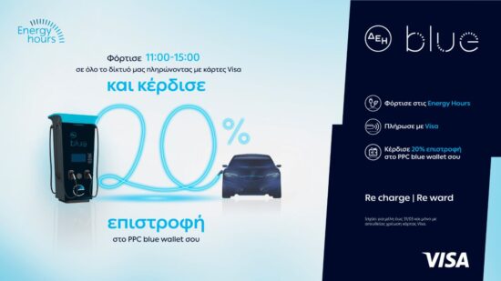 ΔΕΗ blue: 20% επιστροφή, για φόρτιση ηλεκτρικών οχημάτων στις μεσημεριανές «Energy Hours» σε συνεργασία με τη Visa