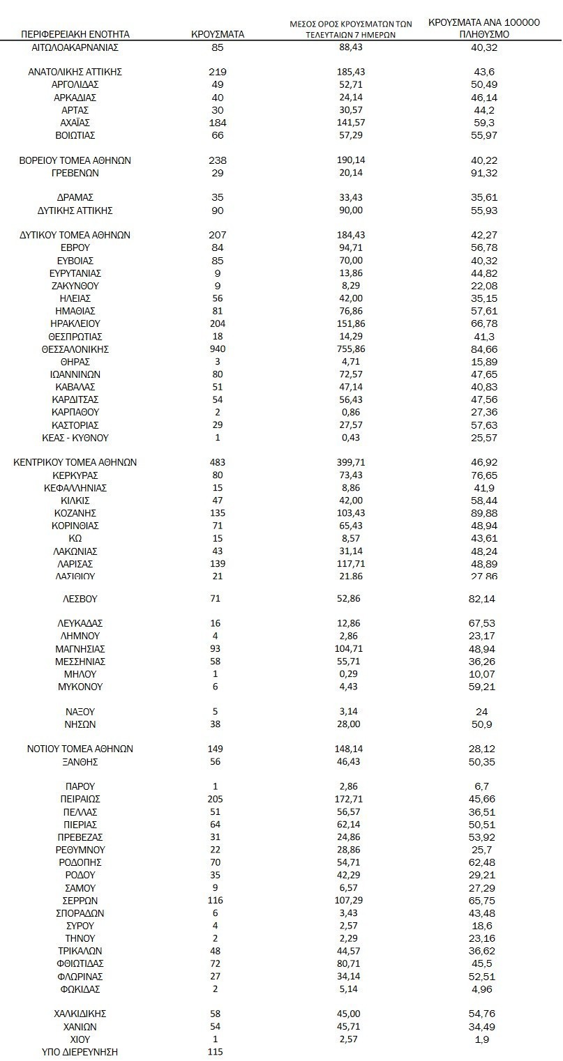 Η κατανομή των 5.517 νέων εγχώριων κρουσμάτων ανά Περιφερειακή Ενότητα παρουσιάζεται στον κατωτέρω πίνακα.