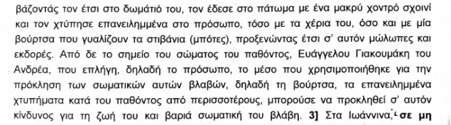 Σε άλλο σκηνικό, ο ίδιος κατηγορούµενος, µε τη συνδροµή άλλων τριών συγκατηγορουµένων του, αφού έπιασε µε τη βία τον 20χρονο, «βάζοντάς τον έτσι στο δωµάτιό του, τον έδεσε στο πάτωµα µε ένα µακρύ χοντρό σχοινί και τον χτύπησε επανειληµµένα στο πρόσωπο, τόσο µε τα χέρια του όσο και µε µια βούρτσα που γυαλίζουν τα στιβάνια (µπότες), προξενώντας έτσι σ’ αυτόν µώλωπες και εκδορές».