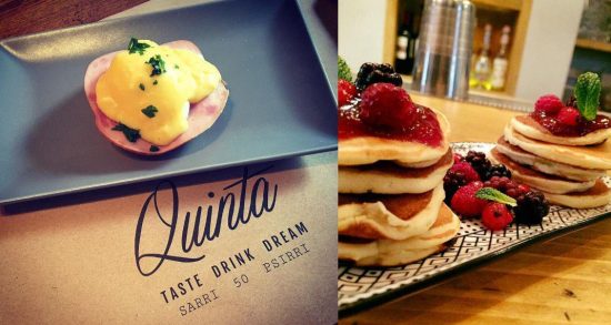 H Quinta επίσης σερβίρει και brunch καθημερινά, όχι μόνο το Σαββατοκύριακο, το οποίο λειτουργεί από τις έντεκα το πρωί μέχρι τις έξι το απόγευμα. Με δέκα ευρώ μπορείτε να παραγγείλετε τρία πιάτα κι ένα ρόφημα. Εκτός από τις κλασικές επιλογές, που στηρίζονται σε συνταγές με αβγά, μπορείτε να δοκιμάσετε μια σαλάτα με κινόα και γαρίδες, πίτσα με ρόκα και αβγό, μια συγκλονιστική τορτίγια με κοτόπουλο, αλλά και μίνι burgers. Αν διψάτε πολύ, επιλέξτε τη σπιτική λεμονάδα με δυόσμο και θα με θυμηθείτε. Στο τέλος μπορείτε να παραγγείλετε ένα τιραμισού – σκέτη απόλαυση, που παρασκευάζεται μπροστά σας, πάνω στο τραπέζι, ενώ πολύ καλή είναι και η πανακότα. Καθημερινά όμως υπάρχουν εκπλήξεις σχετικά με τα επιδόρπια, που όλα φτιάχνονται στην κουζίνα του μαγαζιού.