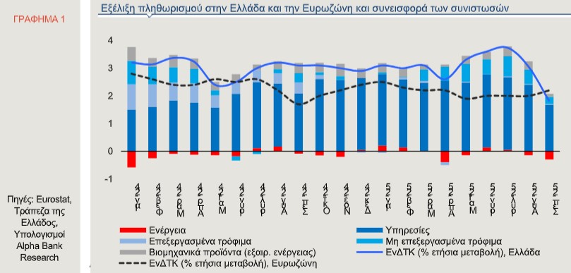Η σημαντική διαφορά των δύο ποσοστών αντανακλά, σε κάποιο βαθμό, το θετικό παραγωγικό κενό της ελληνικής οικονομίας, δηλαδή τις συνθήκες υπερβάλλουσας ζήτησης, έναντι του αρνητικού παραγωγικού κενού της ευρωπαϊκής οικονομίας, δηλαδή τις συνθήκες υπερβάλλουσας προσφοράς, αναφέρει το νέο ενημερωτικό δελτίο οικονομικών εξελίξεων της Alpha Bank.
