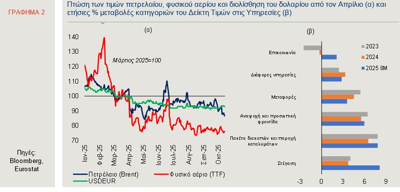 Επιπρόσθετα, υπάρχει και ένα τεχνικό χαρακτηριστικό το οποίο είναι η αυξημένη στάθμιση των υπηρεσιών στον ΕνΔΤΚ στην Ελλάδα . Για το 2025, οι υπηρεσίες στην Ελλάδα αντιπροσωπεύουν σχεδόν το 49% του ΕνΔΤΚ, το οποίο είναι το τρίτο υψηλότερο ποσοστό στην Ευρωζώνη. Αυτό σημαίνει ότι οι αυξήσεις των τιμών των υπηρεσιών που καταγράφονται από την αρχή του έτους είναι περισσότερο επιδραστικές στον ΕνΔΤΚ στην Ελλάδα.