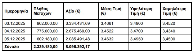 H ΑΛΦΑ ΤΡΑΠΕΖΑ (η ‘Τράπεζα’), σε συνέχεια της από 17.09.2025 ανακοίνωσής της, ενημερώνει ότι, στο Πλαίσιο του Προγράμματος Αγοράς Ιδίων Μετοχών που εγκρίθηκε με την απόφαση της Έκτακτης Γενικής Συνέλευσης των Μετόχων της με ημερομηνία 12.6.2025, κατά το διάστημα 03.12.2025 – 05.12.2025, προέβη σε αγορά μέσω του Χρηματιστηρίου Αθηνών συνολικά 2.339.180 ίδιων μετοχών, με μέση τιμή κτήσης 3,4608 € ανά μετοχή και συνολικό κόστος 8.095.392,17 €.